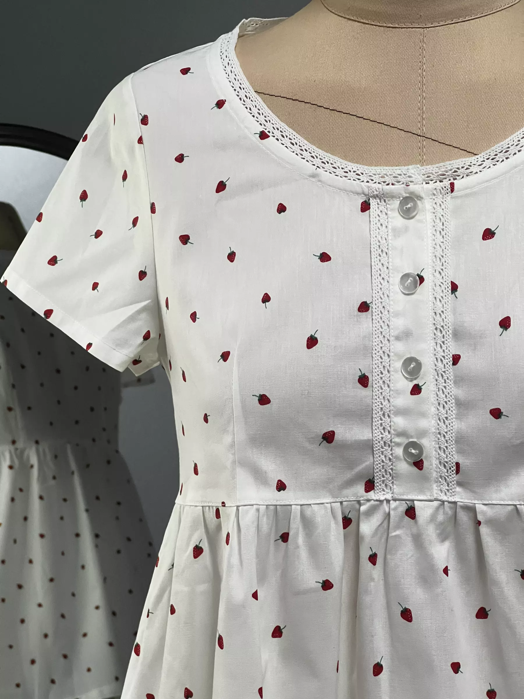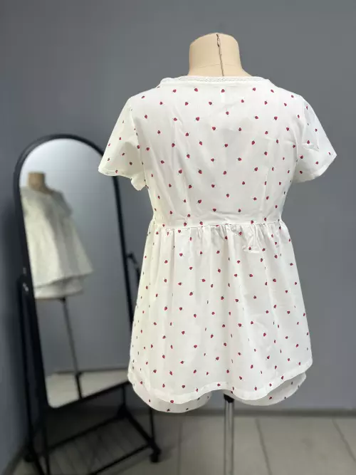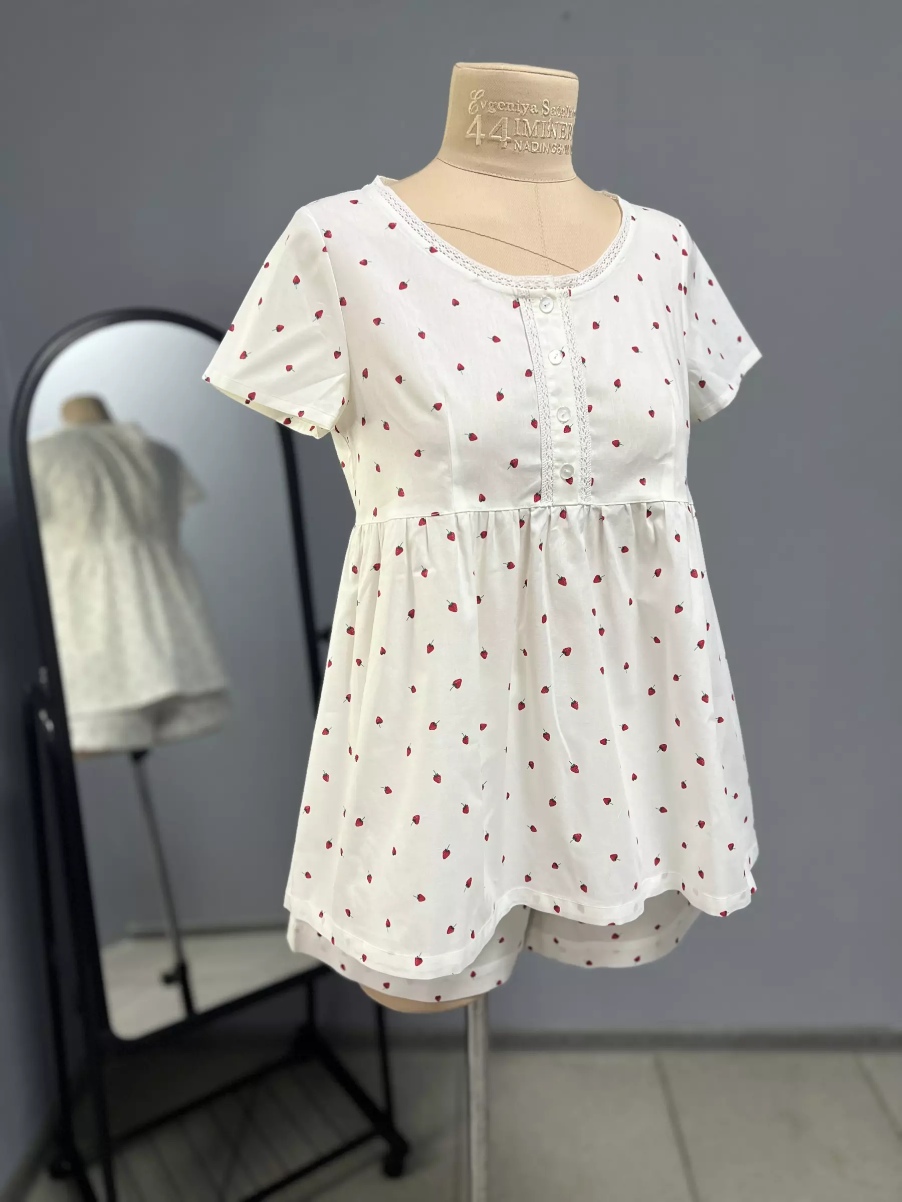 Нежная белая ткань служит изысканным фоном для пикантного принта — сочных клубничек, добавляющих образу игривости и романтичности. Мягкий хлопок приятно прилегает к телу, отлично пропускает воздух и не вызывает раздражения — идеальный выбор для расслабленного отдыха.