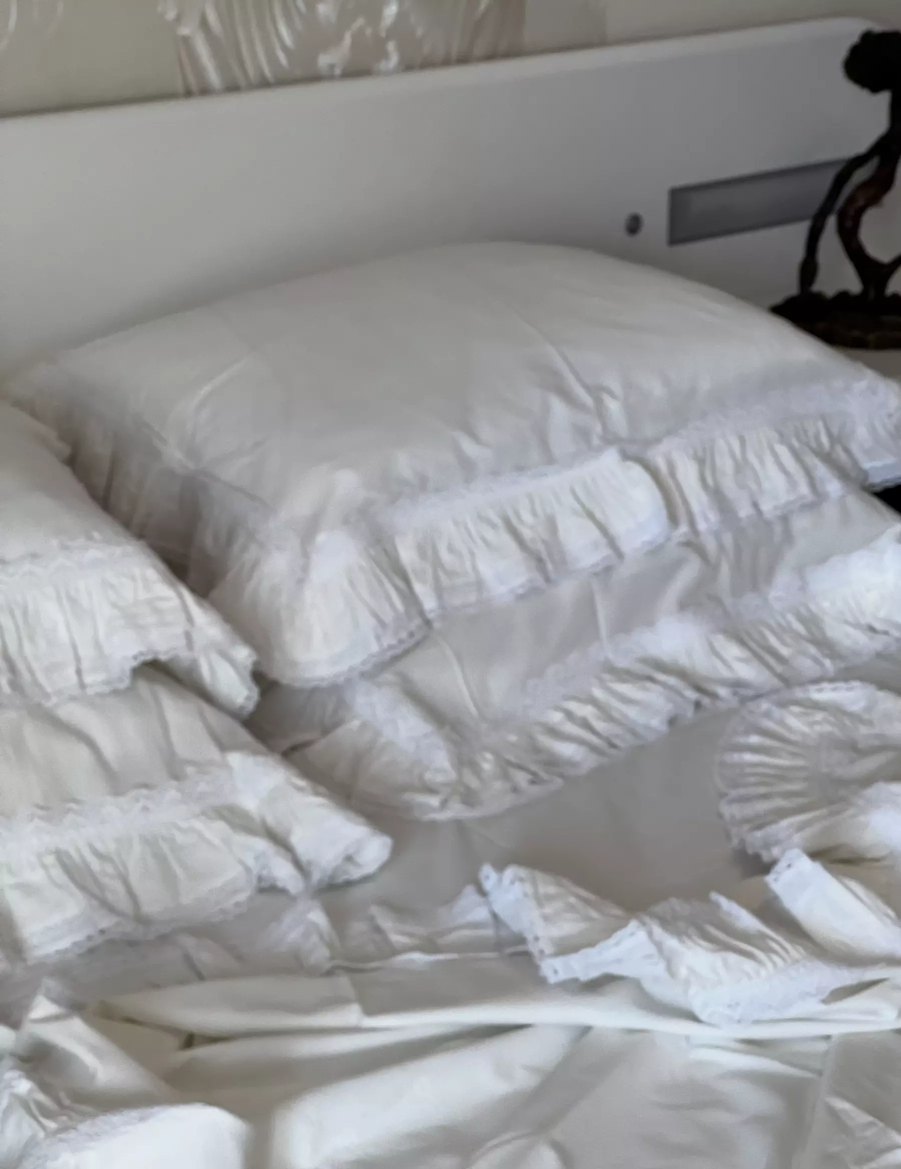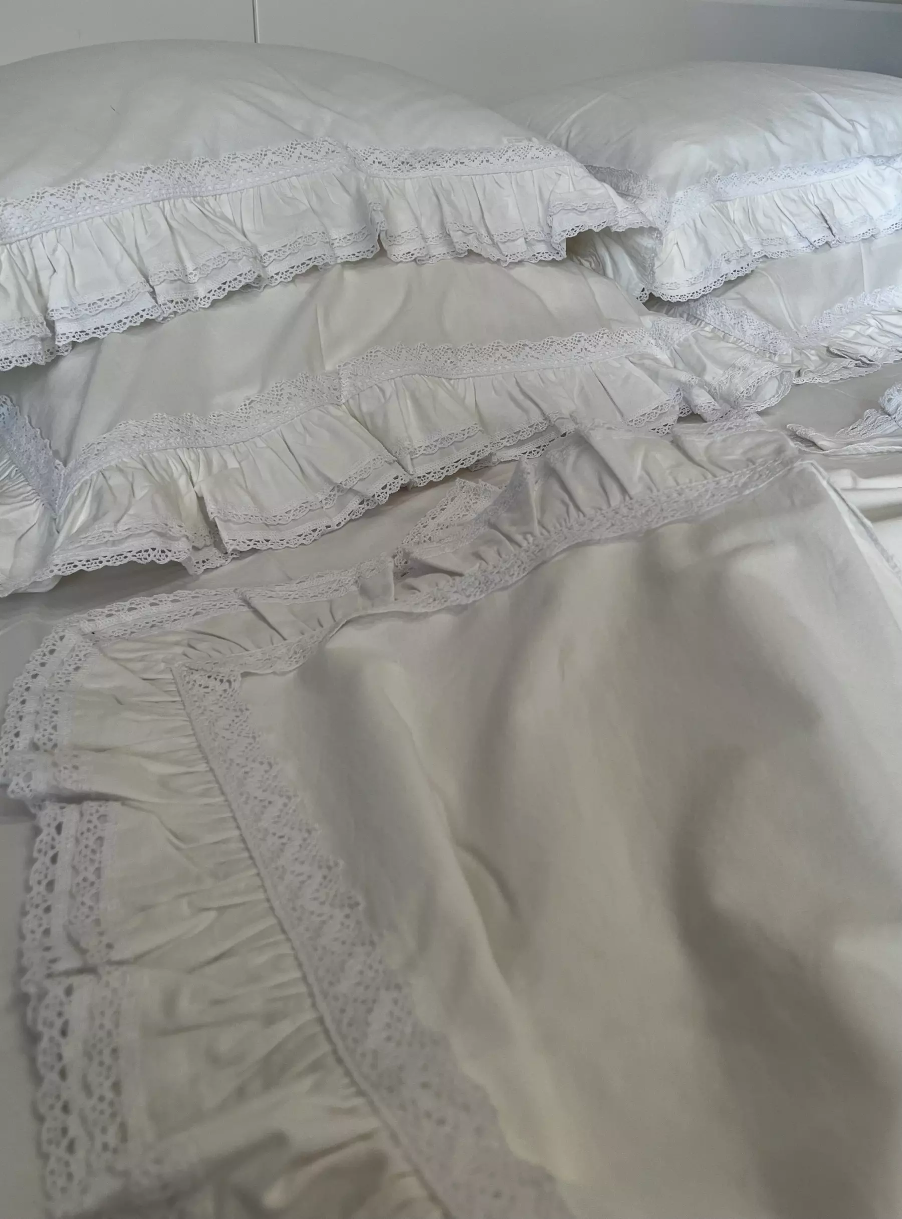 Наволочка с глубоким запахом, двумя рядами оброк 7см и 9см из основной ткани по краю оборки пришито хлопковое кружево шириной 1,5 см и по периметру украшено хлопковым кружевом шириной 3см. Цвет белый теплый. Размер 50см*70см (2шт) и 70см*70см (2шт).