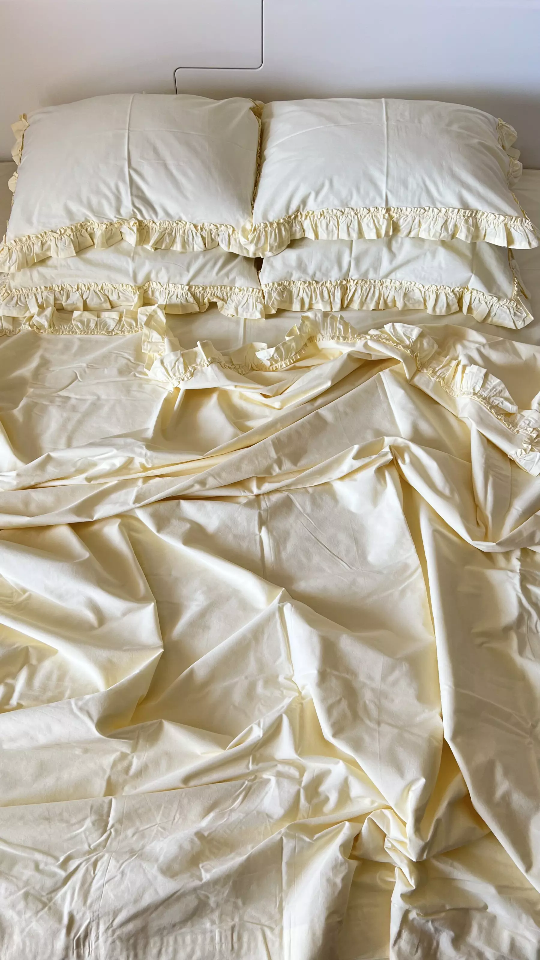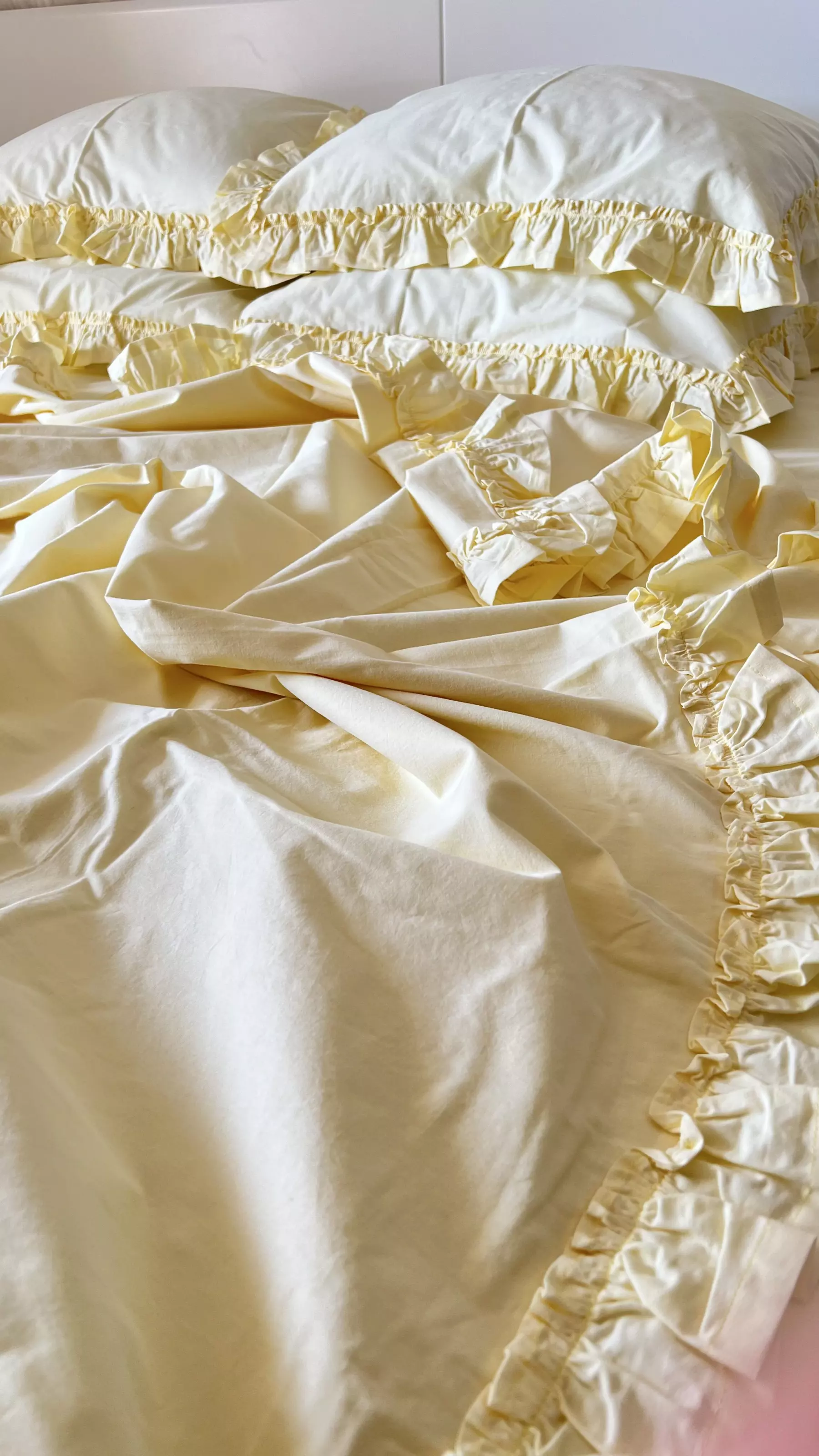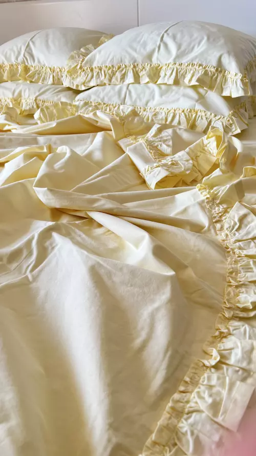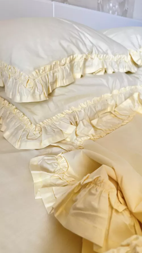 Монохромное исполнение комплекта в сливочно-желтом цвете добавит в вашу спальню солнечного света, тепла, и благородства.