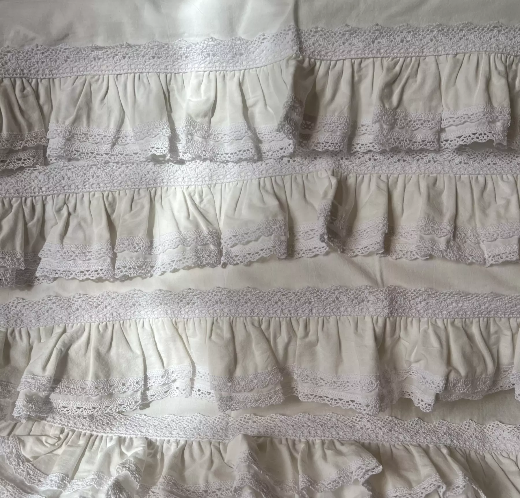 Пододеяльник с завязками, двумя рядами оброк 7см и 9см из основной ткани по краю оборки пришито хлопковое кружево шириной 1,5 см и по периметру украшено хлопковым кружевом шириной 3см. Цвет: белый теплый. Размер 200см*220см (+/- 2см), 1шт.