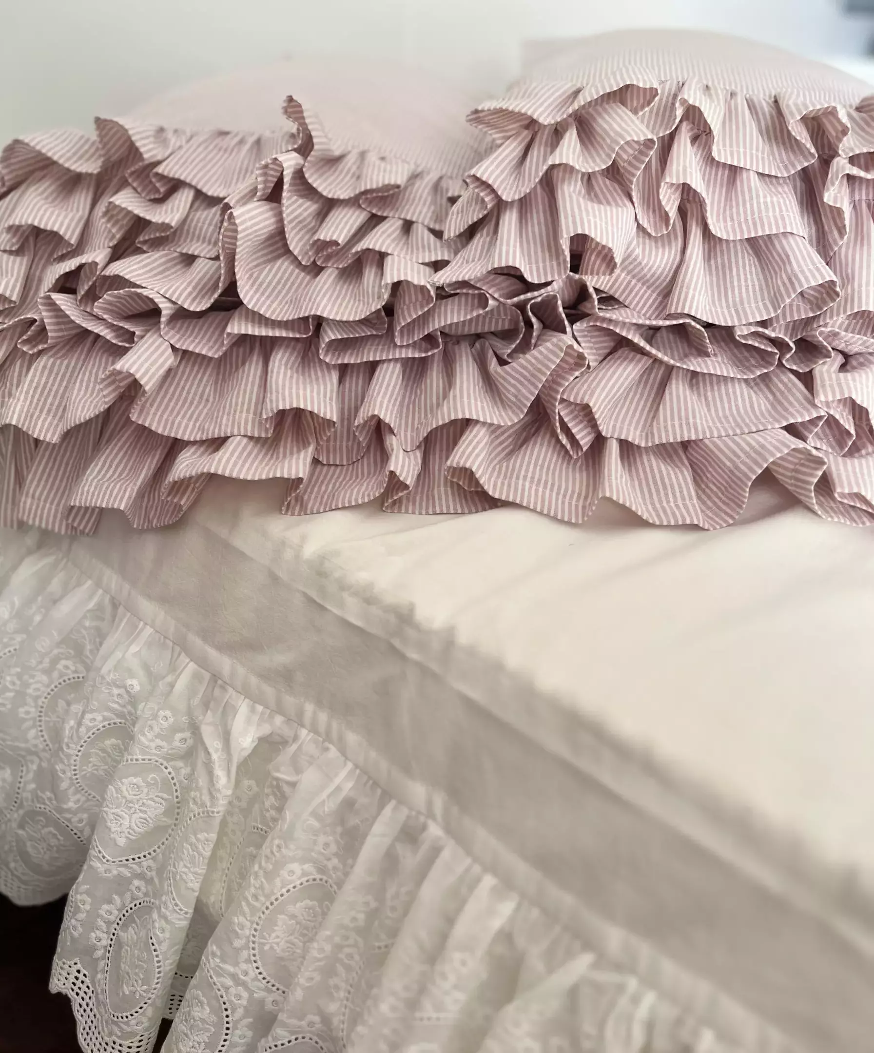 «Ницца» - комплект постельного белья в винтажном стиле, оформлен большим количеством каскадных оборок шириной 9 см на наволочках и пододеяльнике из основной ткани и простыне из хлопкового шитья шириной 30 см (+/- 1 см). Мелкая полоска пудрового цвета (3 мм) создает нежный контраст в сочетании с молочным. Изысканность и элегантность этого постельного белья сделает его идеальным дополнением не только обстановки в стиле Прованс, украсит любой интерьер и создаст для вас атмосферу уютного отдыха.