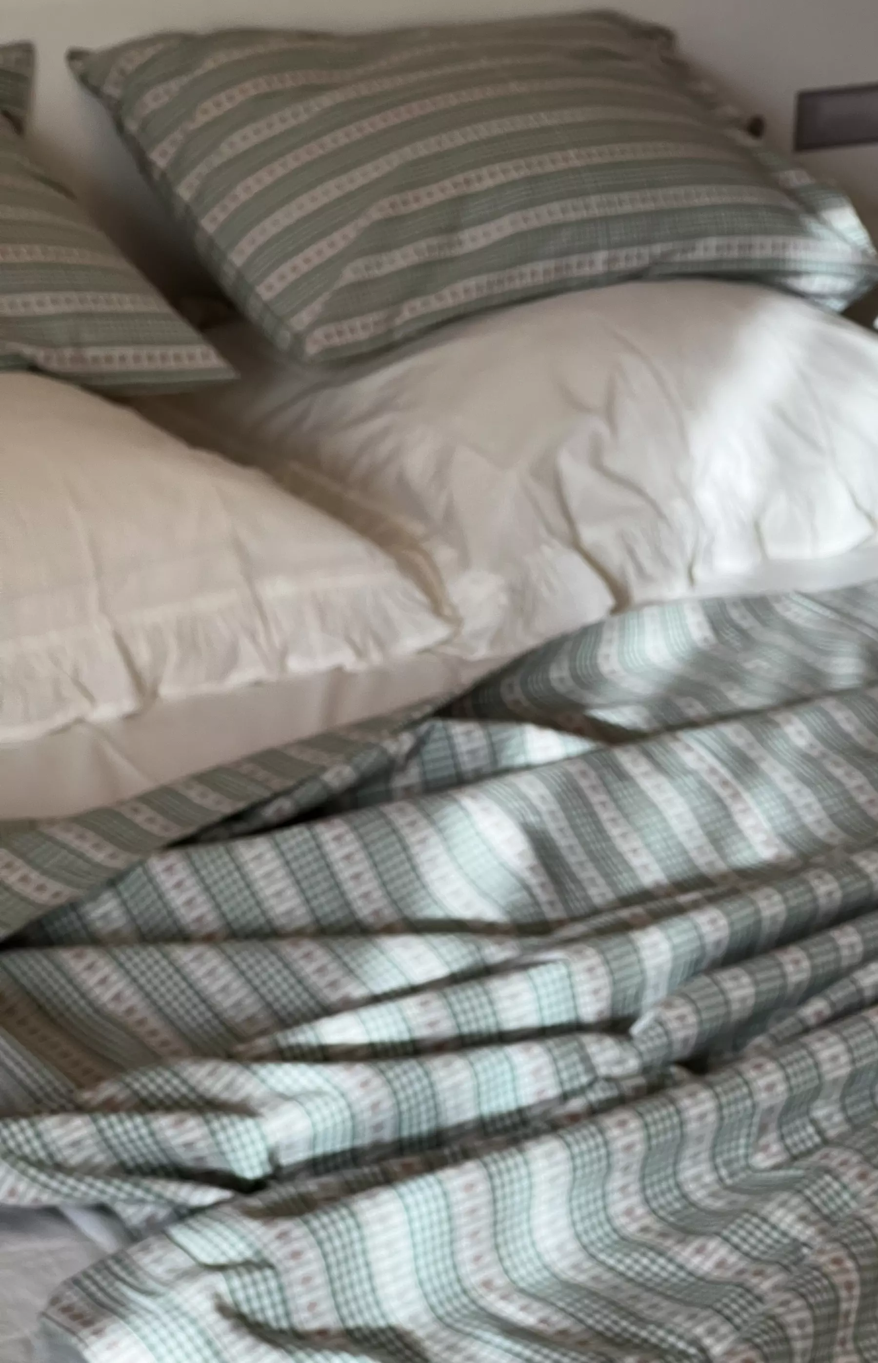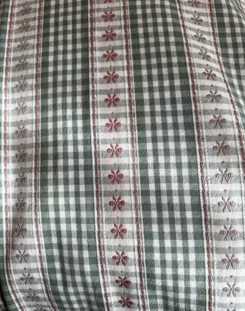 - наволочка с глубоким запахом 50см*70см (*/- 1 см, 2 шт) выполнена из вареного хлопка жаккардового плетения в виде мелкой клеточки разбеленного зеленого цвета на теплом белом и нежных цветочков пудрового цвета и слоновой кости,