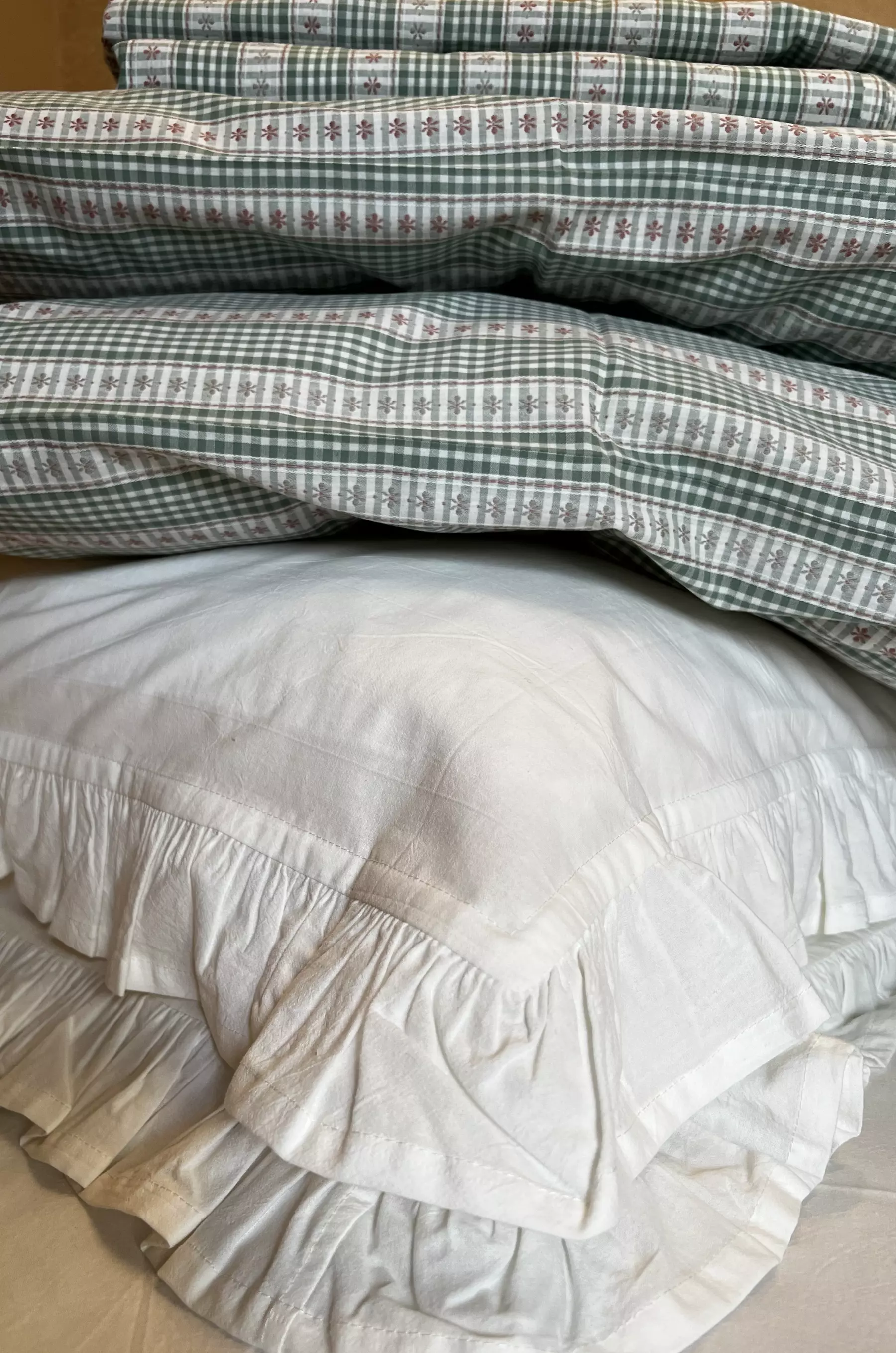 - пододеяльник с завязками выполнен из вареного хлопка жаккардового плетения в виде мелкой клеточки разбеленного зеленого цвета на теплом белом и нежных цветочков пудрового цвета и слоновой кости, размер 145см*205см (+/- 2см), 2шт.