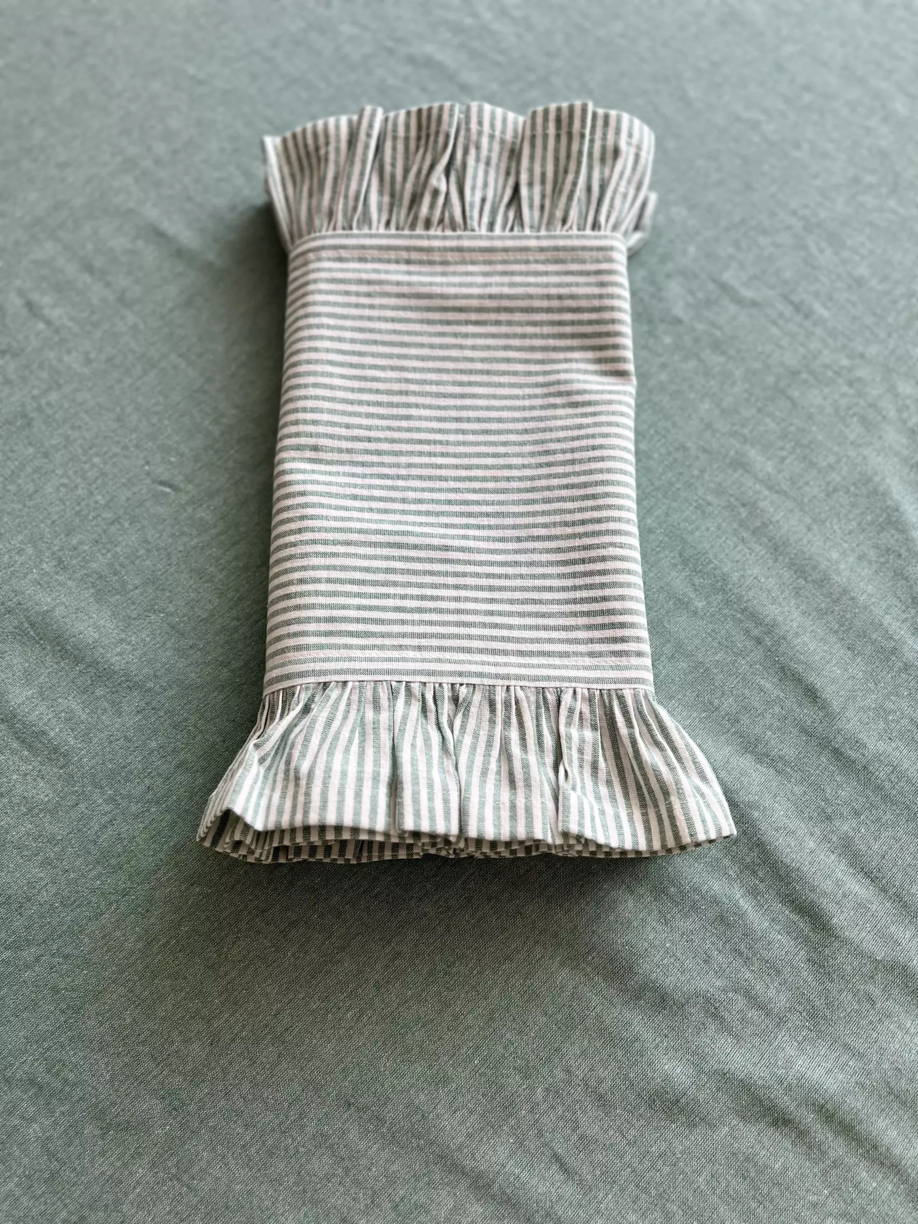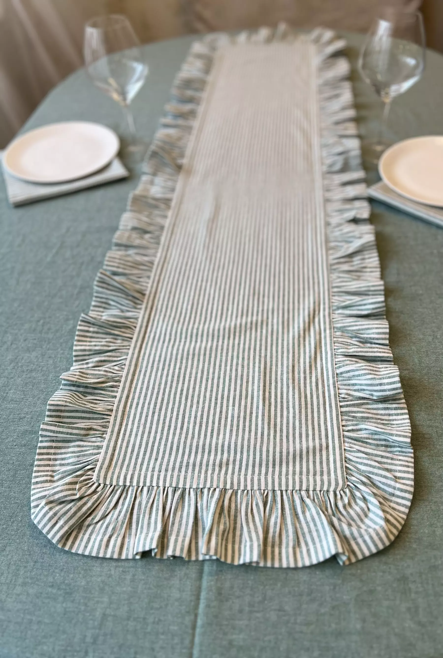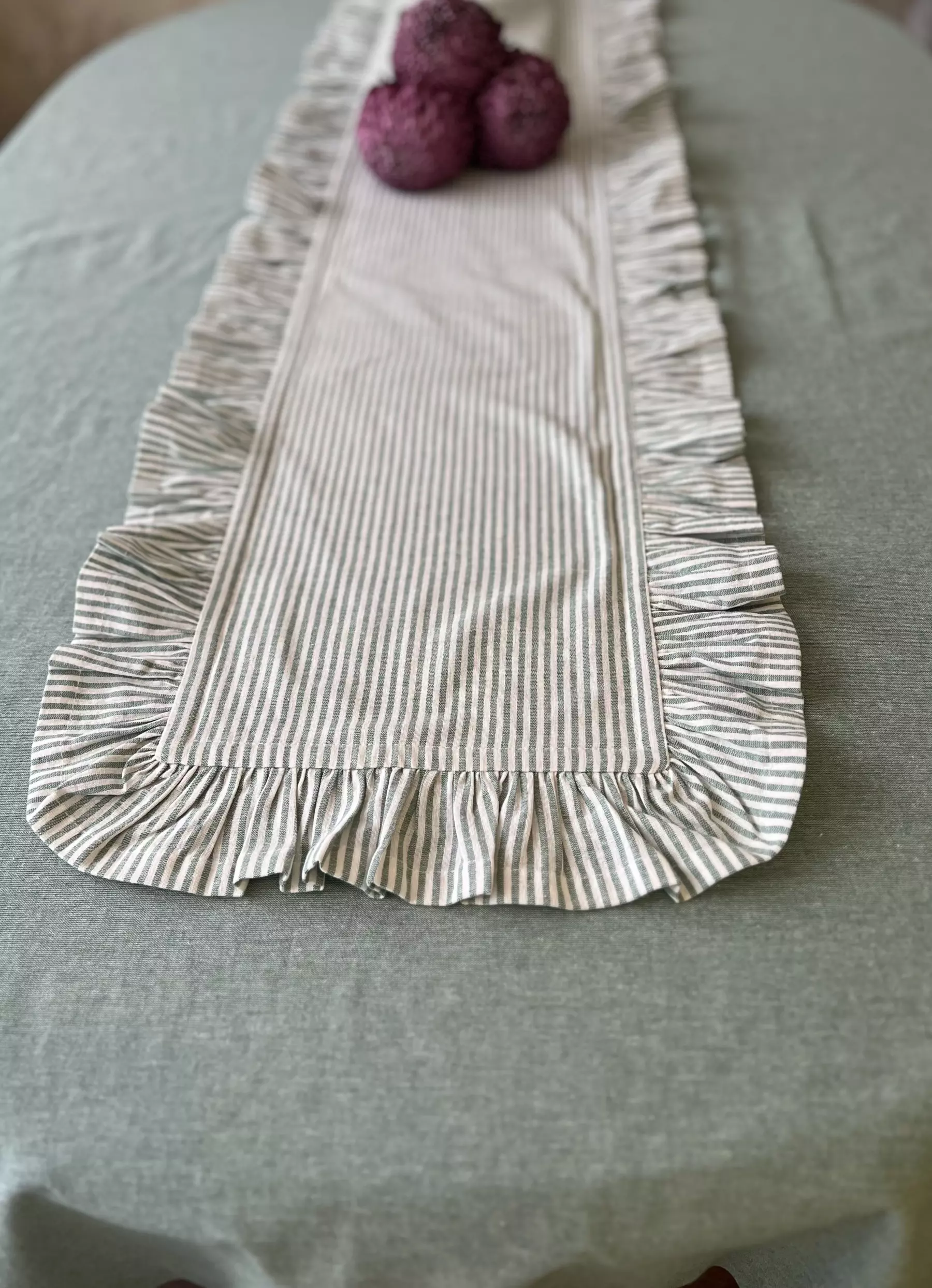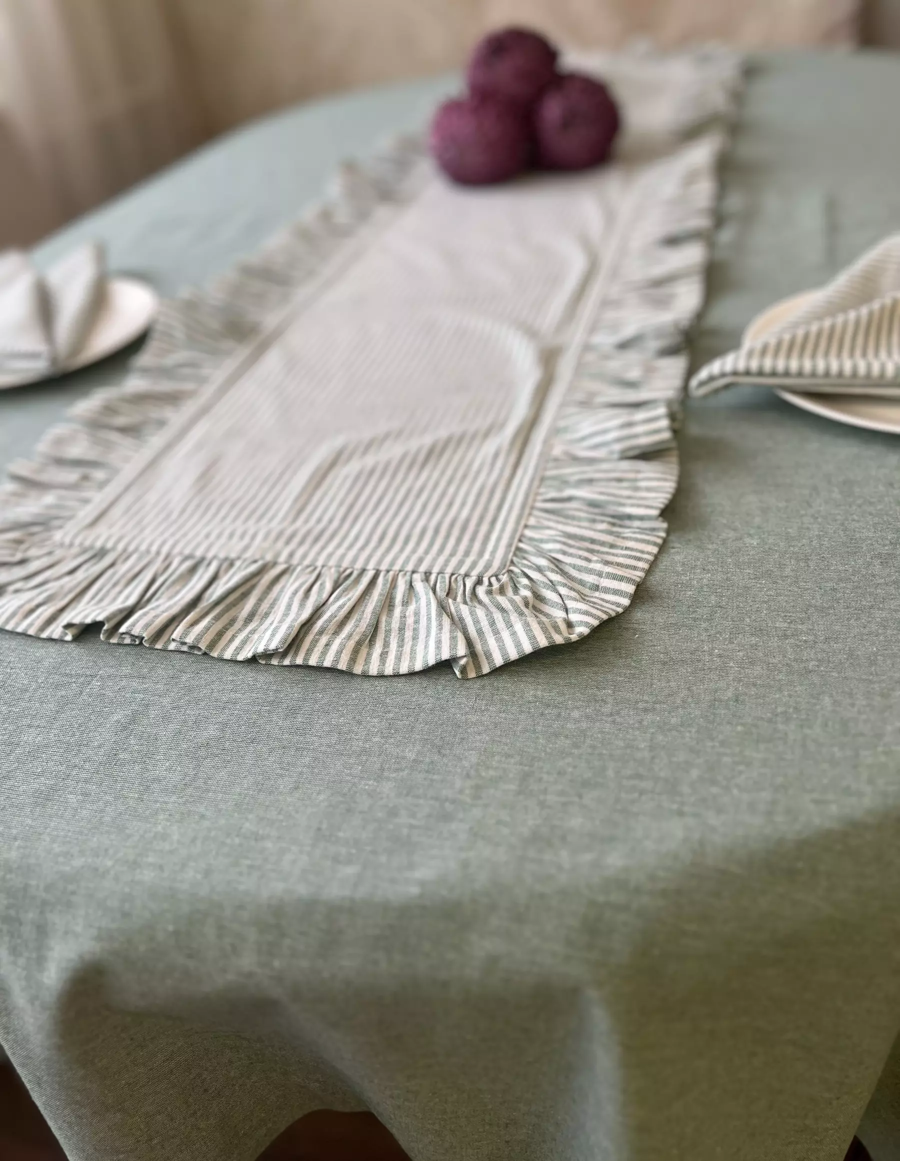 Для пошива столовой дорожки в винтажном стиле мы выбрали натуральное смесовое полотно, где гармонично сочетаются полоски цвета полыни и белого. Ткань тактильно приятна, устойчивая к частым стиркам и простая в уходе. Экологичный выбор в пользу текстильных изделий подчеркнет уют и индивидуальный стиль.