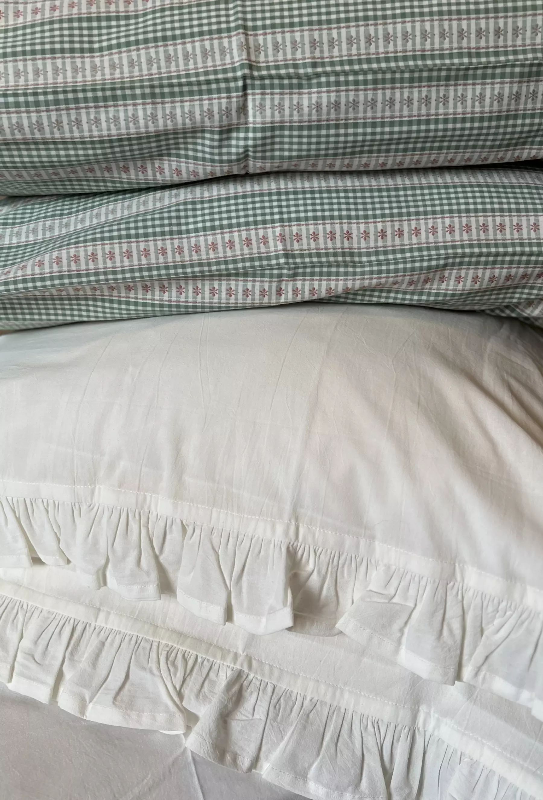 Простыня с оборками из хлопкового шитья по длинным сторонам. Цвет: белый теплый. Размер 260см*270см (+/-2см), 1шт.