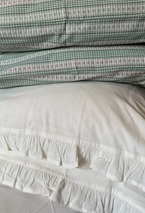Наволочка с глубоким запахом. Цвет: жаккардовое плетение, мелкая клеточка разбеленого зеленого цвета на теплом белом и нежных цветочков пудрового цвета и слоновой кости. Размер 50см*70см (+/-1см), 2шт.