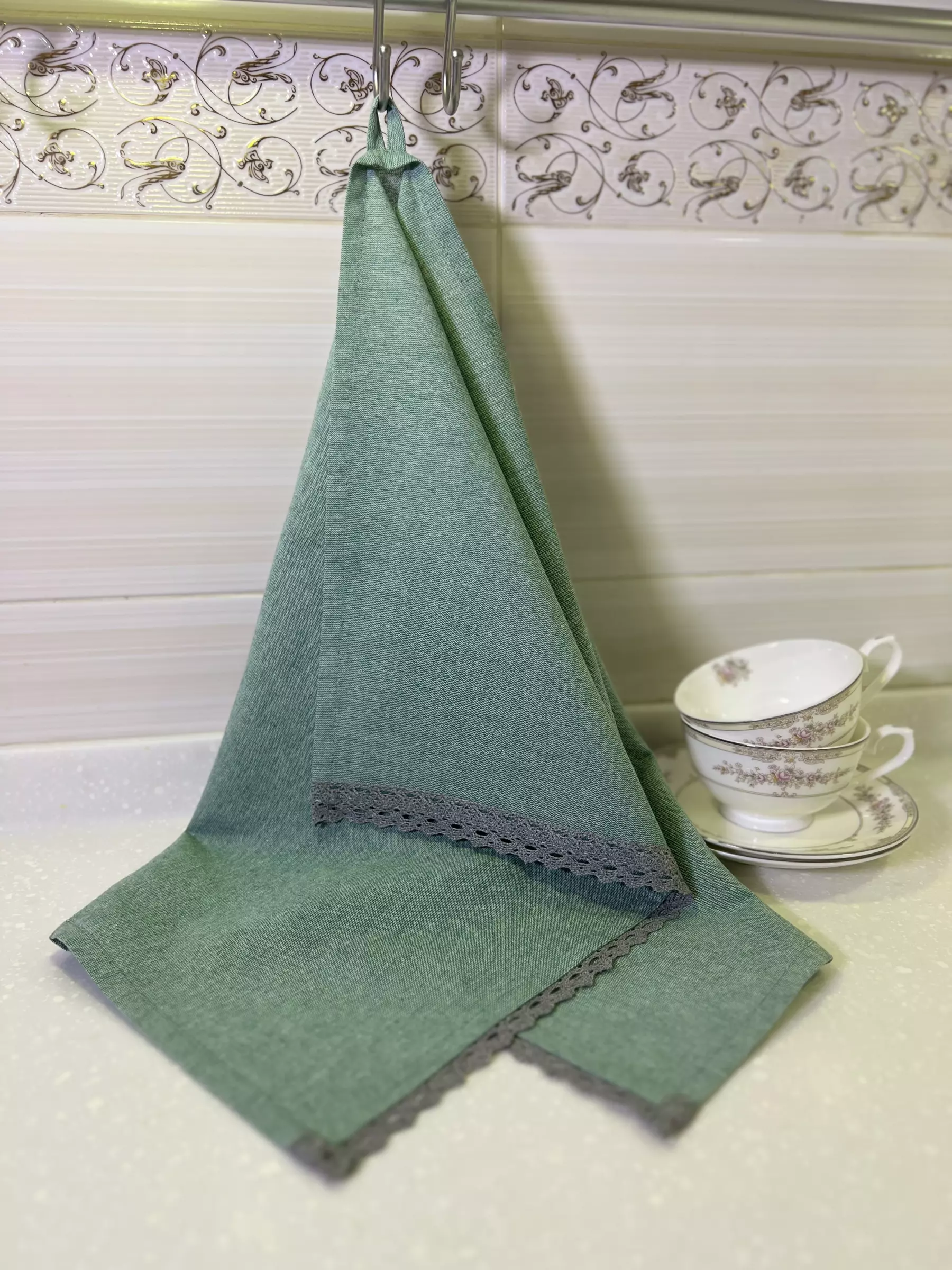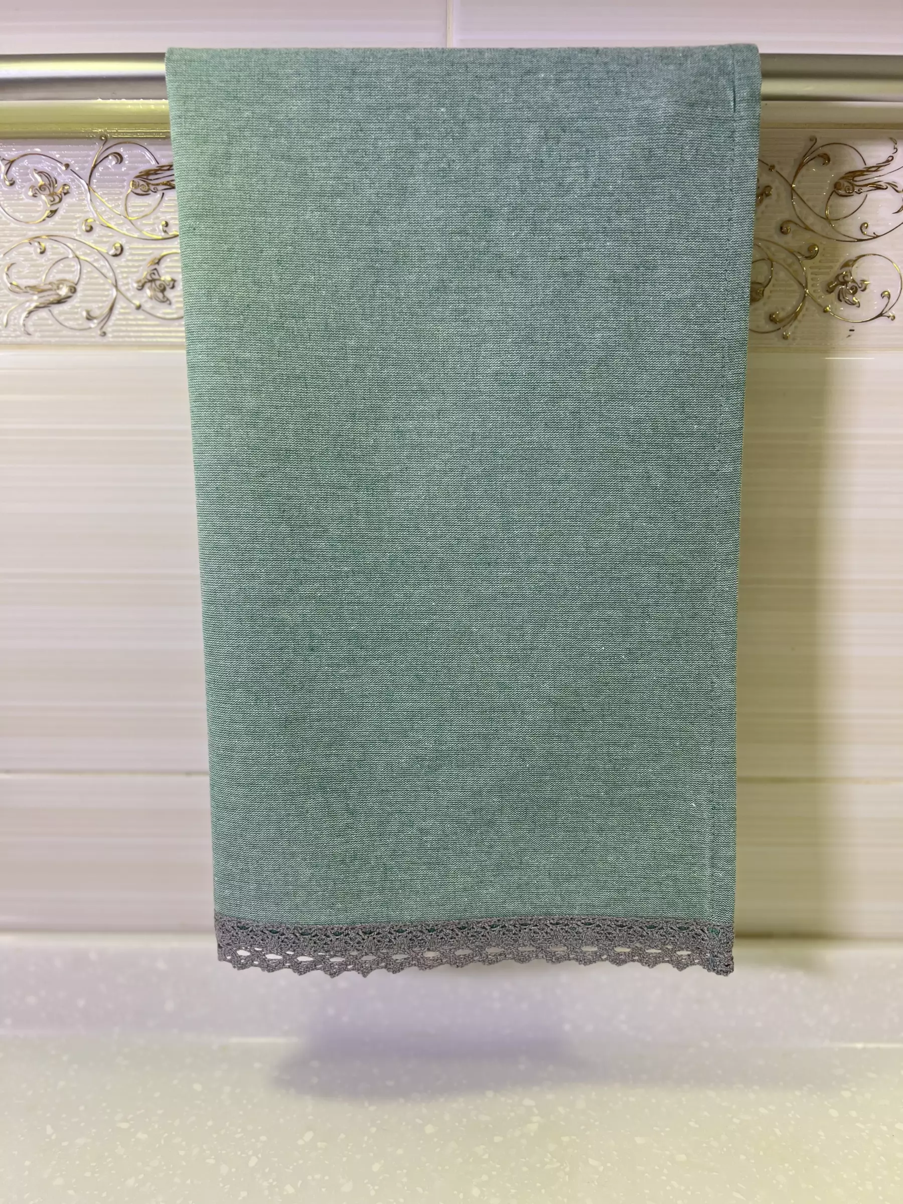 Кухонное полотенце с хлопковым кружевом в цвете припыленной полыни выполнено из натуральной смесовой ткани (29% лен и 71% хлопок).