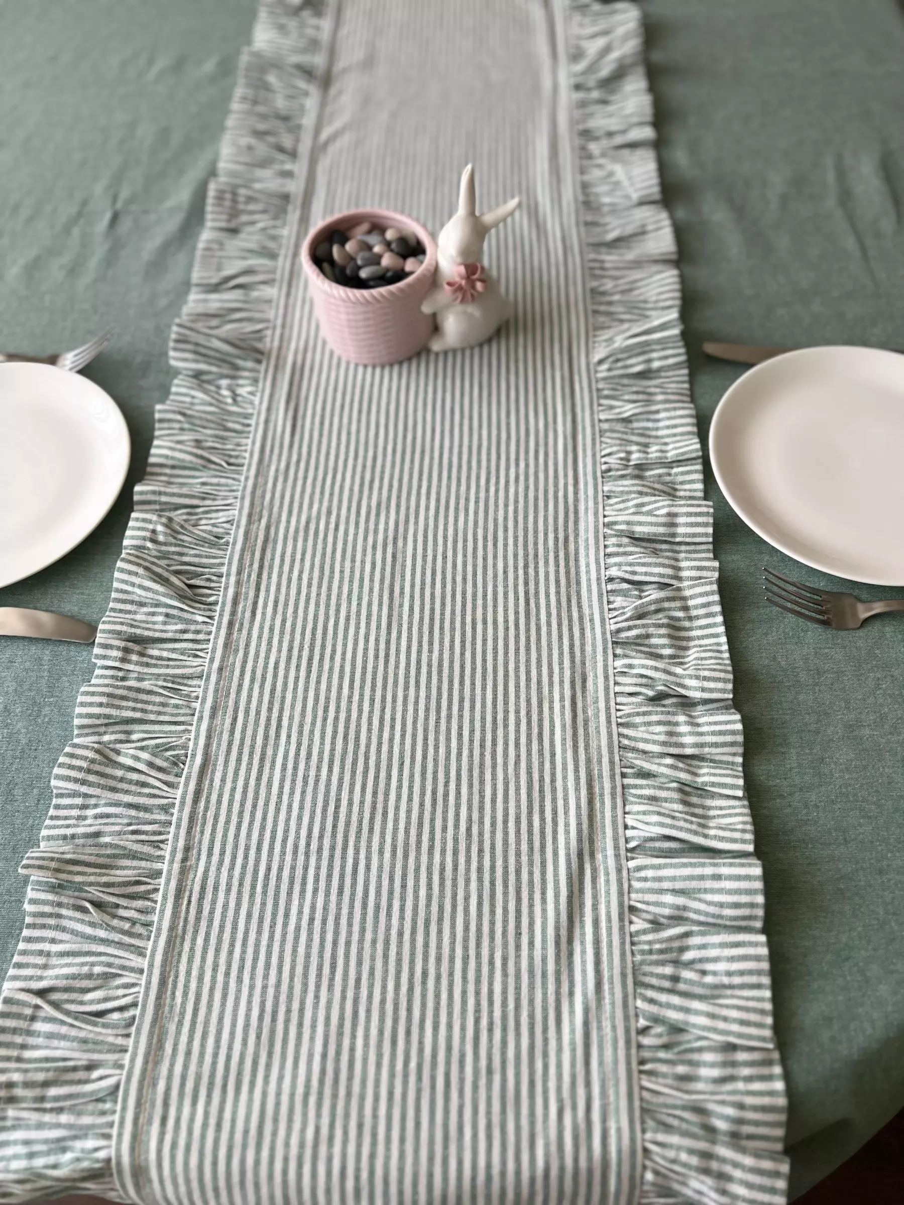 Для пошива столовой дорожки в винтажном стиле мы выбрали натуральное смесовое полотно, где гармонично сочетаются полоски цвета полыни и белого. Ткань тактильно приятна, устойчивая к частым стиркам и простая в уходе. Экологичный выбор в пользу текстильных изделий подчеркнет уют и индивидуальный стиль.