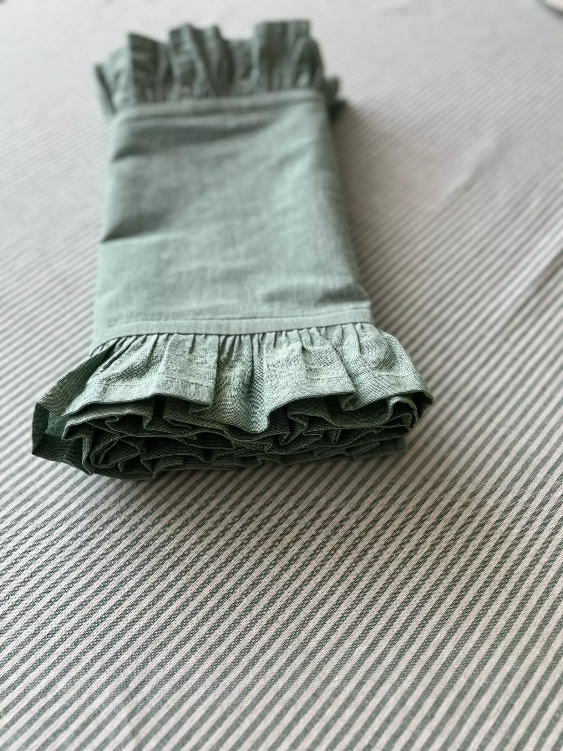 Для пошива столовой дорожки в винтажном стиле мы выбрали натуральное смесовое полотно цвета припыленной полыни. Ткань тактильно приятна, устойчивая к частым стиркам и простая в уходе. Благородный оттенок скатерти органично впишется в любой интерьер, добавив вашему дому глубины и благородства.