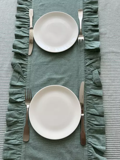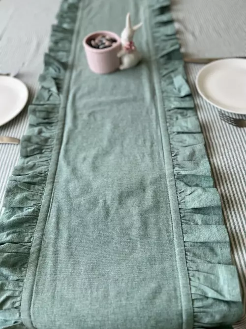 Текстильная дорожка "Шепот трав" с оборками - аксессуар на вашем столе, который не останется незамеченным и подчеркнет изысканный стиль, создаст теплую и уютную домашнюю атмосферу. Оборки по двум длинным сторонам дорожки добавляют особой роскоши этому изделию.